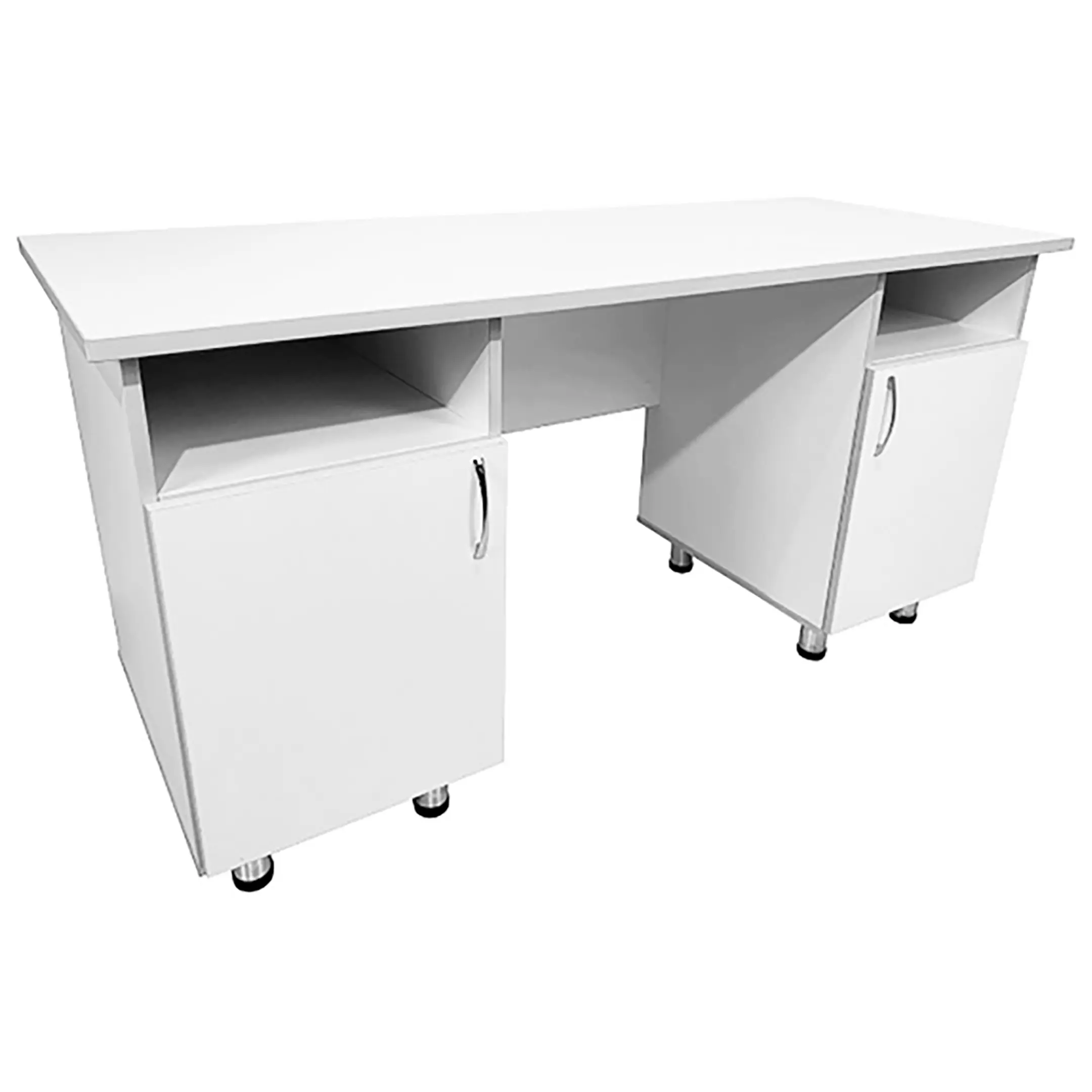• Этот стол оборудован двумя боковыми тумбами, каждая из которых имеет нишу и отдел с дверкой и полкой внутри, обеспечивая удобное хранение необходимых материалов и инструментов. Дизайн выполнен в белом цвете ЛДСП с кромкой светло-серого оттенка, придавая изделию современный и профессиональный вид.
