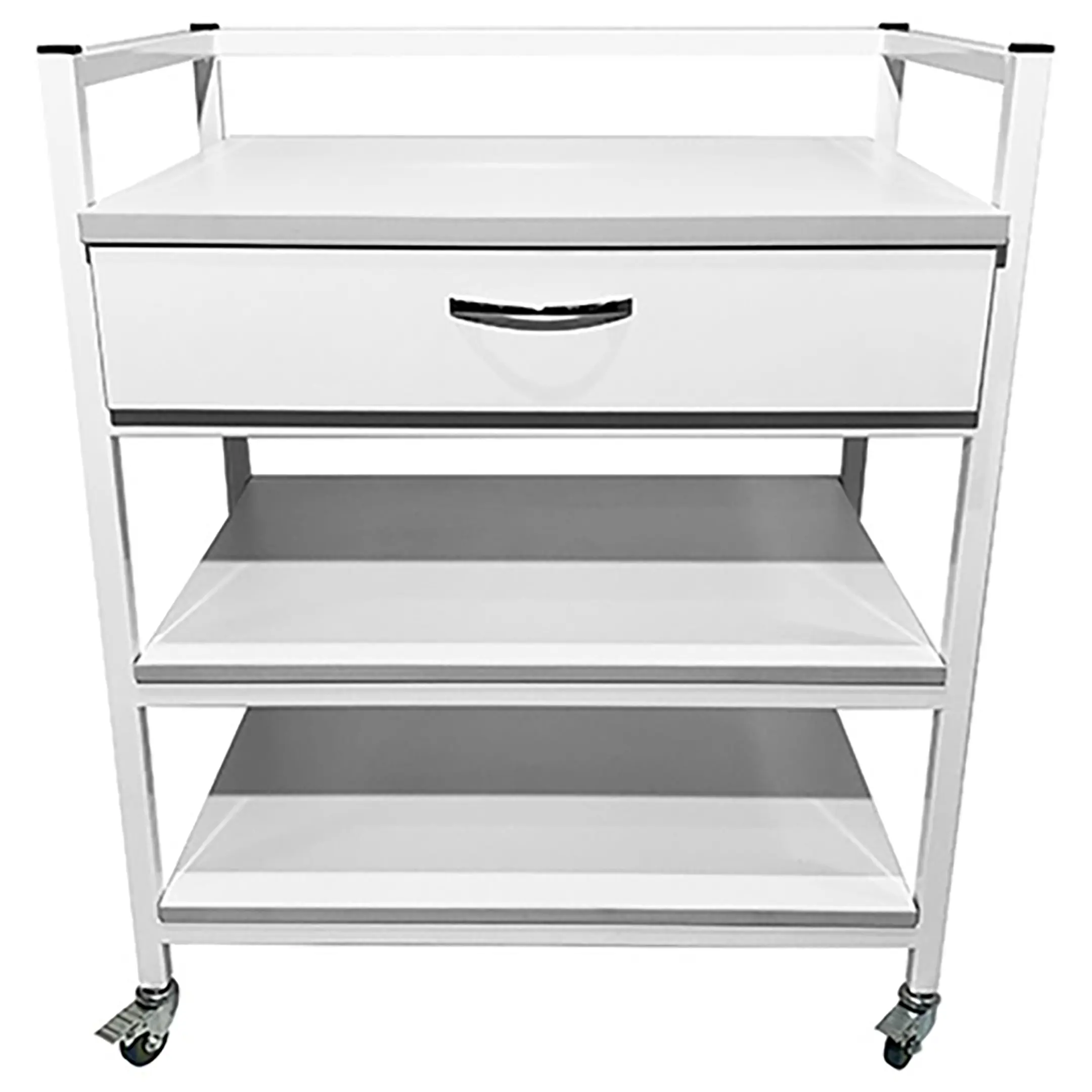 Стол лабораторный мобильный СЛм 17.001 (белый) представляет собой идеальное решение для временного размещения и удобного перемещения различных инструментов, предметов или приборов в медицинских учреждениях и лабораториях. Модель оснащена выдвижным ящиком, двумя полками и установлена на колесные опоры. Каркас выполнен из стального профиля, столешница из ЛДСП толщиной 16 мм.