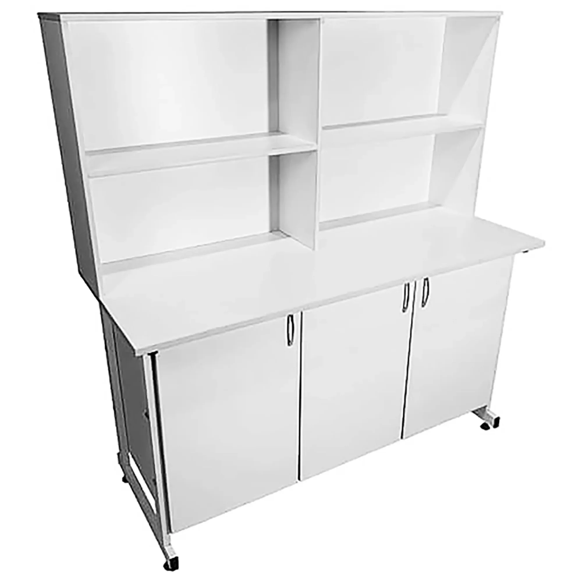 Стол-тумба лабораторная СТл 18.009 с надстройкой (белый) — это идеальное решение для организации рабочего пространства лаборанта, занимающегося проведением химических исследований и нуждающегося в хранилище для различных предметов. Модель оснащена слева отделением с распашной дверкой и полкой, справа — отделением с двойными распашными дверцами и полкой, а также надстройкой с четырьмя нишами. Каркас выполнен из стального профиля, столешница из ЛДСП толщиной 22 мм.