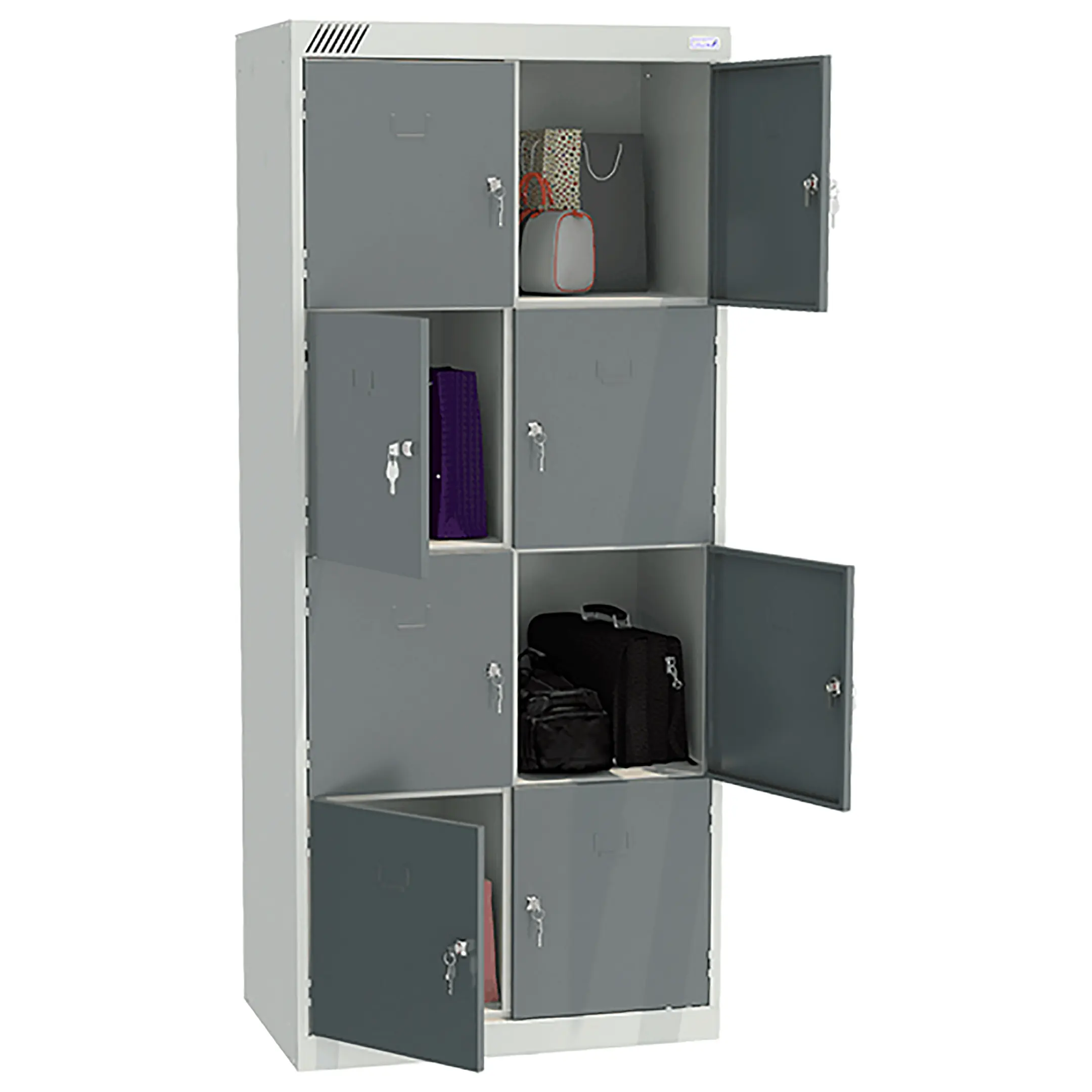 - Вместительная конструкция — две секции и восемь ячеек обеспечивают индивидуальное хранение для нескольких человек.