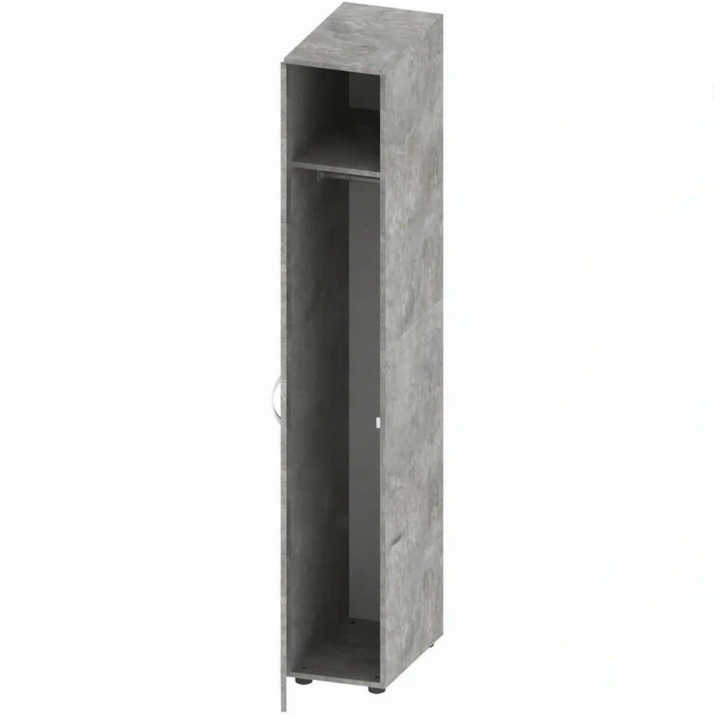 Шкаф пенал для одежды ОФ-СТ-168, Цемент — это компактное и функциональное решение для хранения одежды в образовательных, офисных, административных и других учреждениях. Модель изготовлена из качественной ЛДСП толщиной 16 мм в цвете Цемент, оснащена полкой для головных уборов, штангой для вешалок, замком и регулируемыми опорами.
