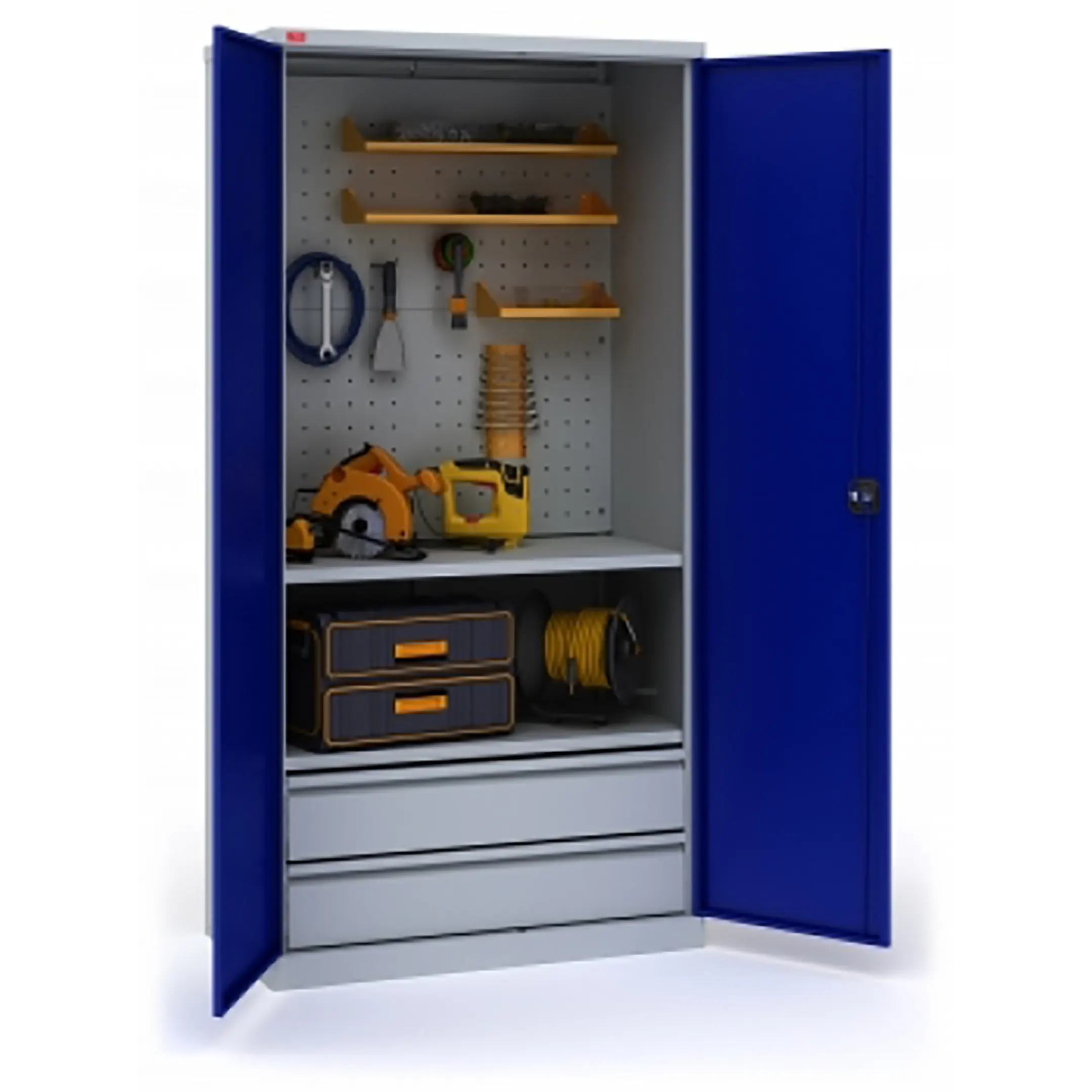 - Надежная защита содержимого — прочный стальной корпус и запирающиеся на встроенный замок двери обеспечивают защиту инструмента от несанкционированного доступа, кражи, а также от пыли и случайных повреждений. Это базовый, но эффективный уровень безопасности.