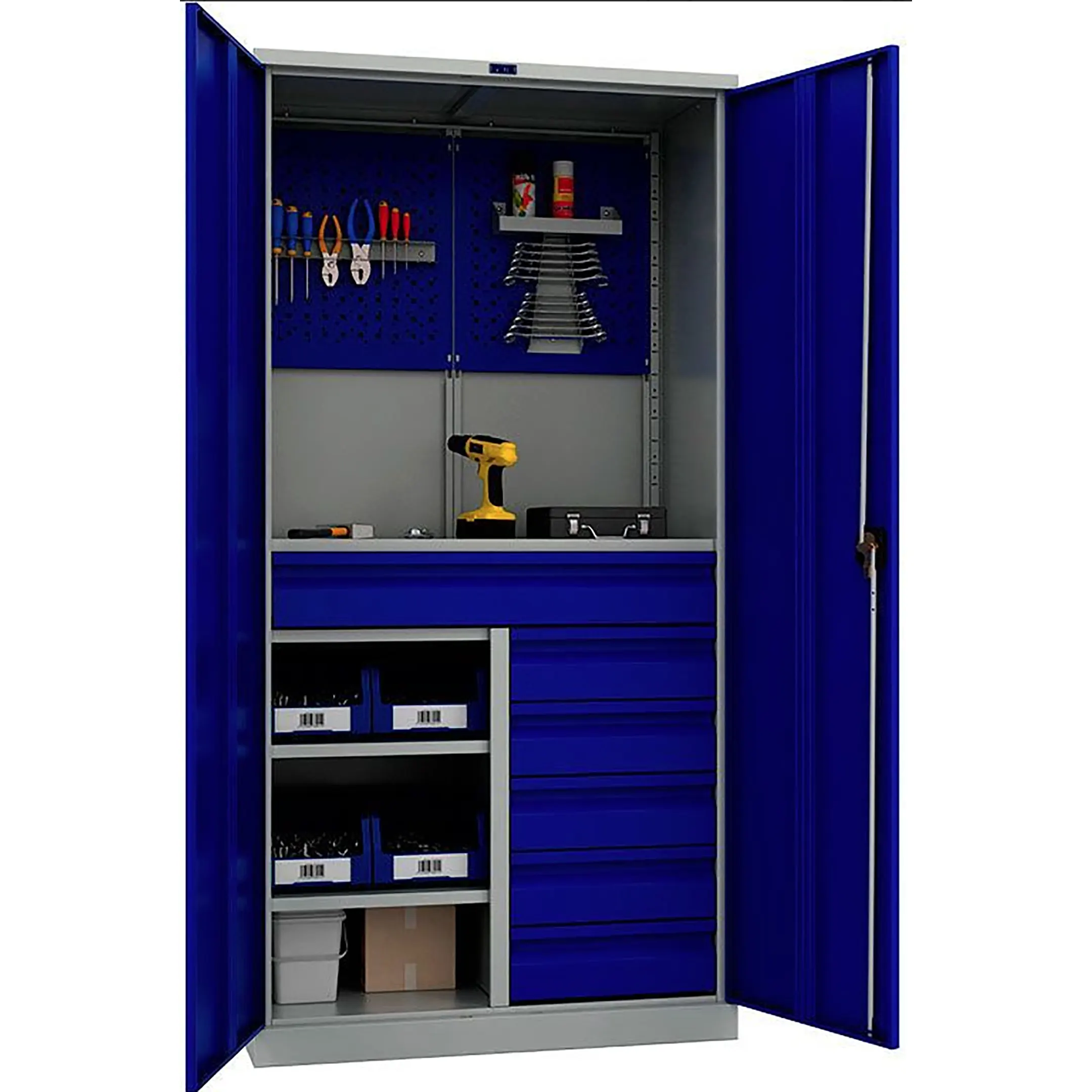 - Модульная система ящиков для идеальной организации — шкаф оснащен многочисленными выдвижными ящиками разной высоты, что позволяет рационально сортировать инструмент: мелкие отделения для метизов и мелкого инструмента, средние — для ручного инструмента, глубокие — для электроинструмента и тяжелой оснастки. Верхнее отделение с полками предназначено для самых габаритных предметов.