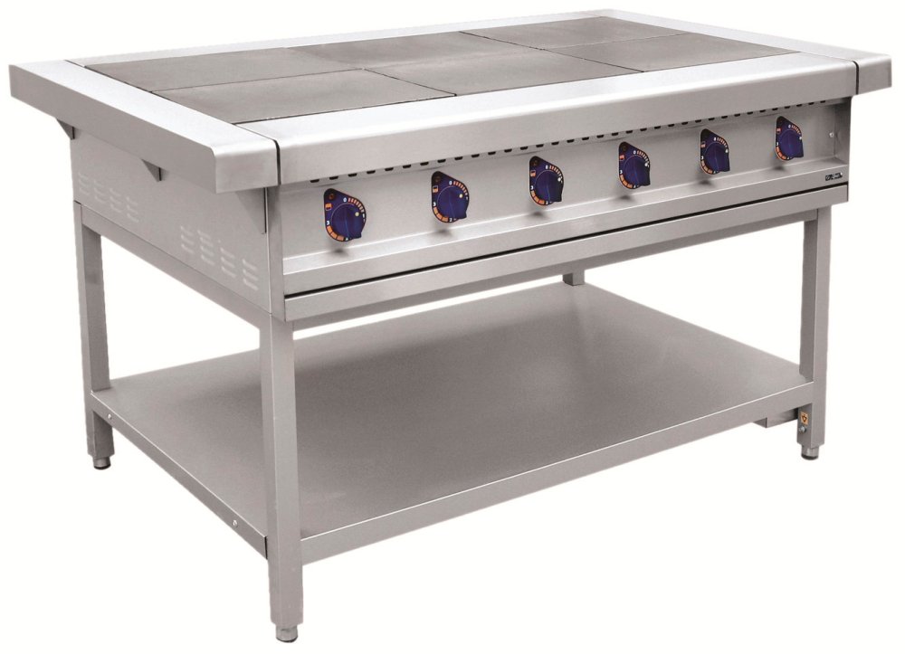 Электрическая плита ЭП-6П — это профессиональное кухонное оборудование, предназначенное для приготовления первых, вторых и третьих блюд. Плоские прямоугольные чугунные конфорки, плотно прилегающие к друг другу, вместе с двумя боковыми столешницами обеспечивают удобное перемещение посуды по всей поверхности плиты. В качестве нагревательных элементов используются ТЭНы. Плита оснащена семипозиционными пакетными переключателями, которые позволяют производить плавную регулировку мощности. Максимальная температура конфорок — 480 °C.