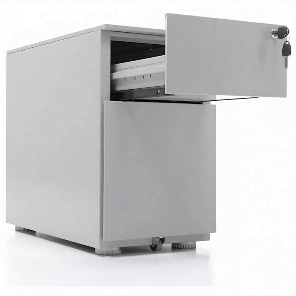 Опции: пластиковые лотки и металлический ящик для канцелярских принадлежностей и других предметов. Возможность комбинирования цветов: корпус + фасады ящиков и крышка (конструкция тумбы металл+металл). Или отделка фасадов ящиков и крыши тумбы ламинированной плитой ЛДСП (конструкция тумбы металл+ЛДСП)
