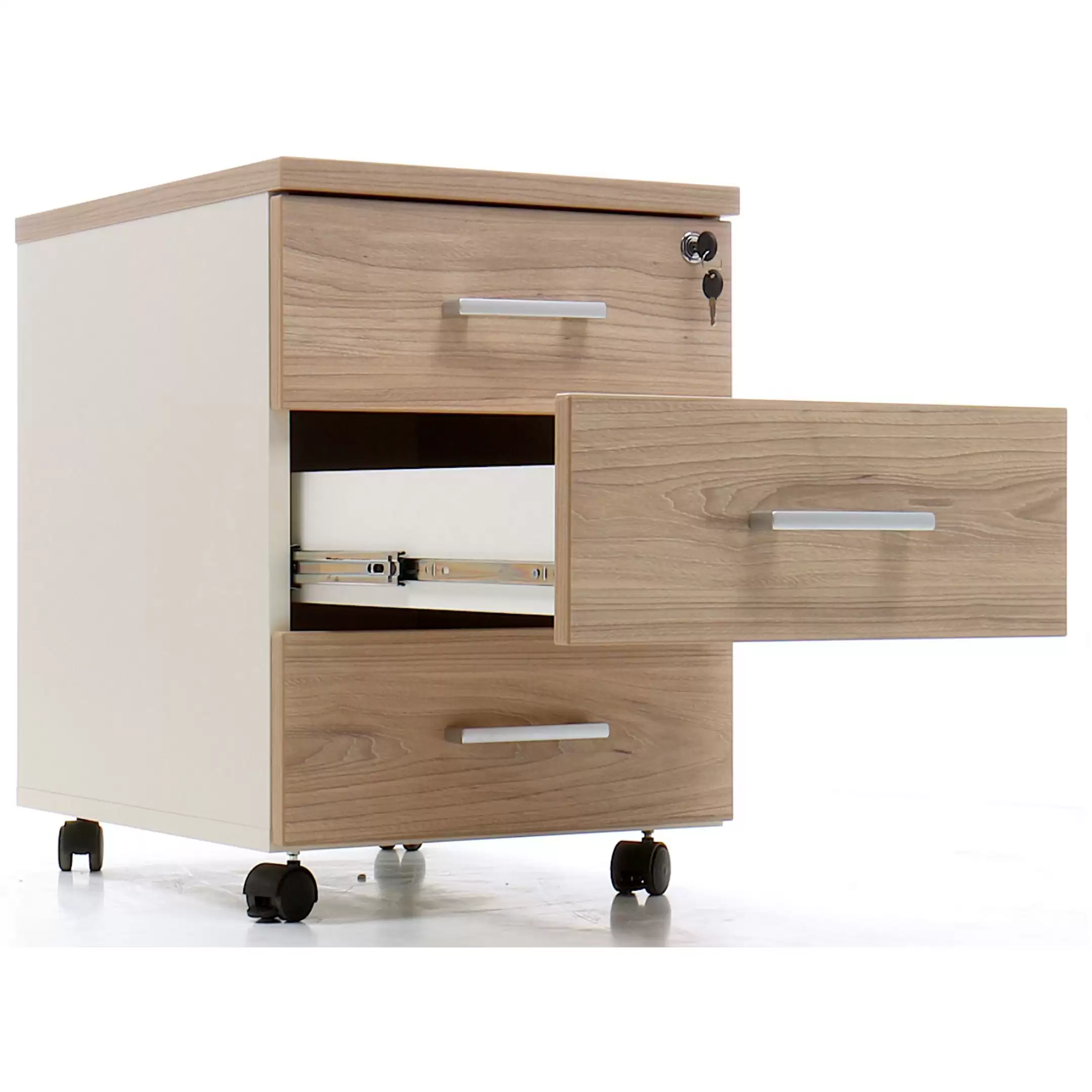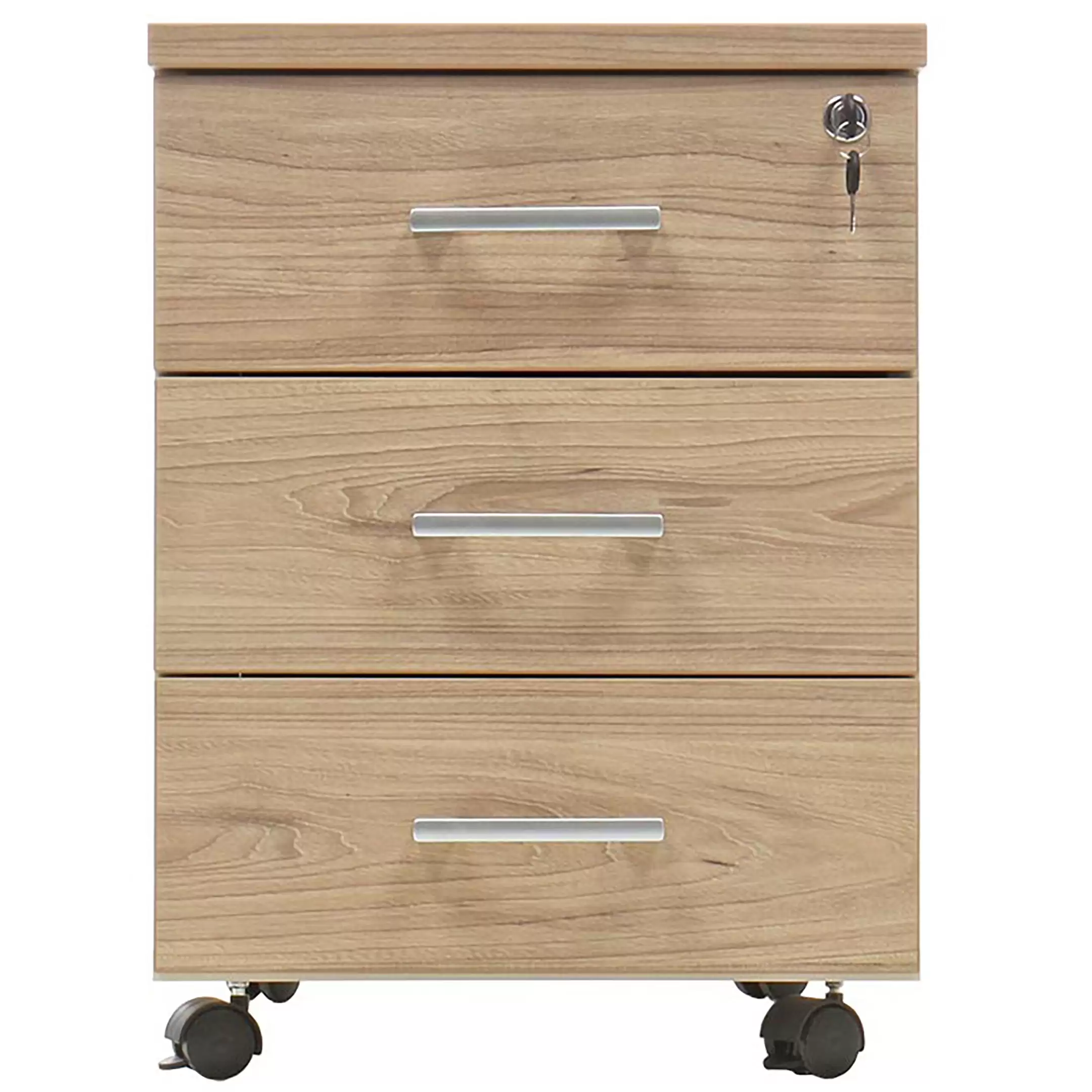 • запирается центральным замком и оснащена пластмассовым лотком для канцелярских принадлежностей в верхнем ящике;