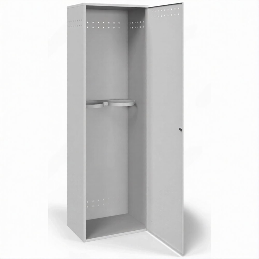 - Надежная защита от хищений и вандализма — усиленная сварная конструкция, массивные сварные петли и возможность установки серьезных запорных устройств (врезные замки, навесные замки повышенной секретности) делают этот компактный шкаф настоящим сейфом для газовых баллонов, эффективно защищающим дорогостоящее имущество даже при размещении в проходных местах.