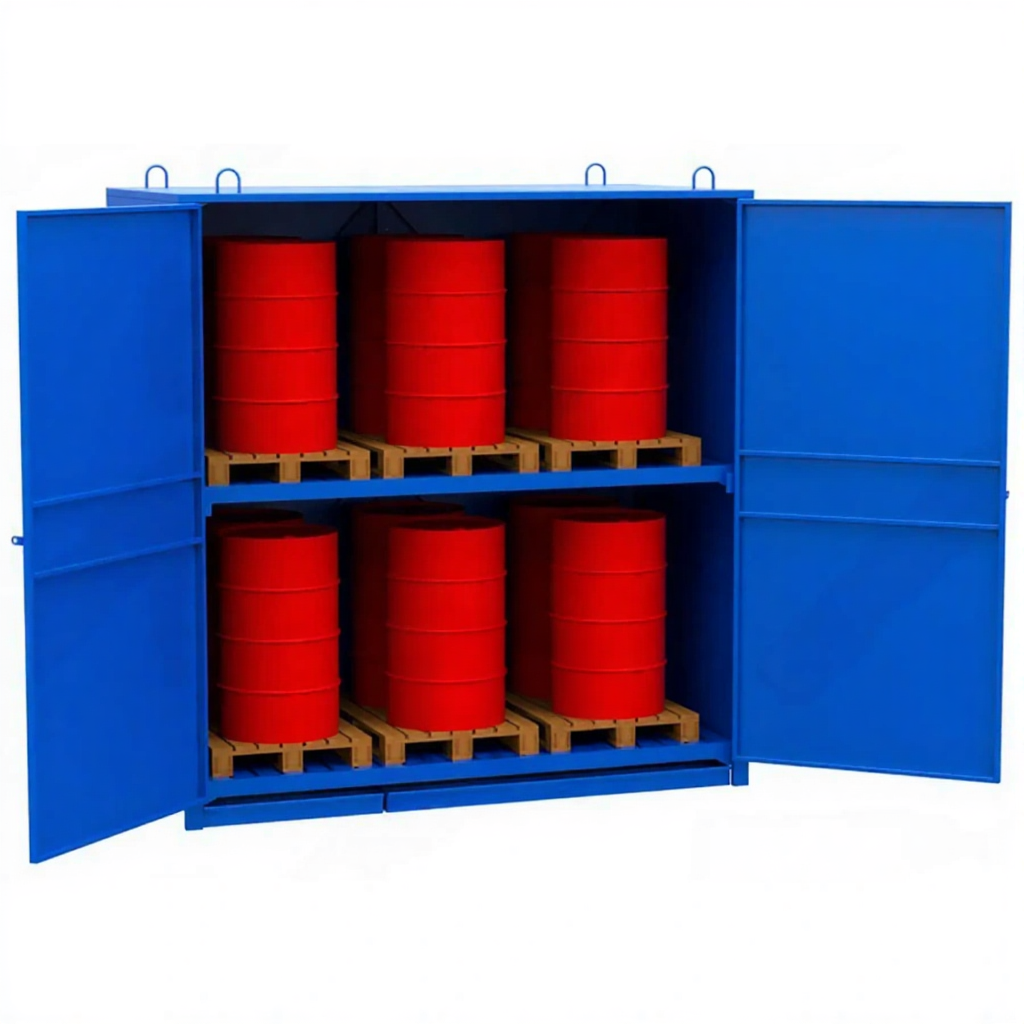 Шкаф для хранения 12-ти бочек 3000х2910х1550, металлический настил, сточный поддон — это промышленное и сверхнадежное решение для безопасного, организованного хранения большого количества бочек с жидкостями, химикатами, маслами или другими материалами на предприятиях, складах и в логистических центрах. Модель с габаритами 3000х2910х1550 мм представляет собой крупногабаритный металлический шкаф-навес, рассчитанный на 12 стандартных бочек, и оснащенный ключевыми элементами безопасности: металлическим настилом для удобного доступа и сточным поддоном для сбора возможных протечек.