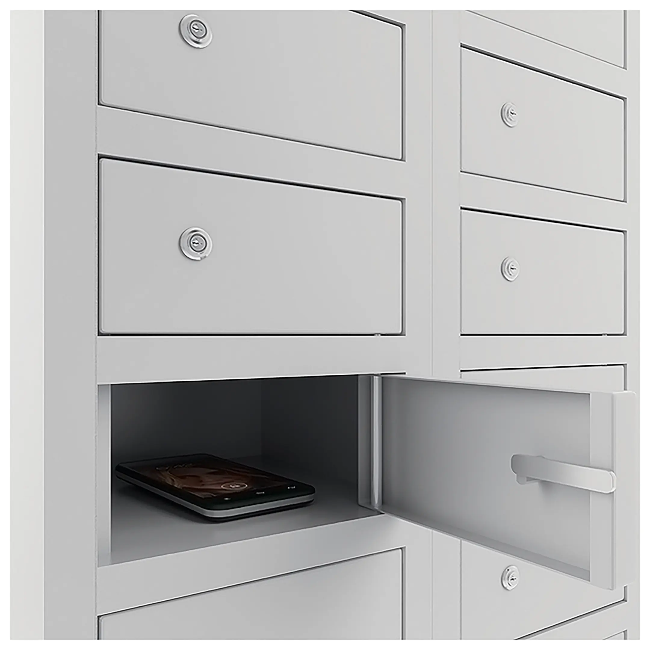 - Экстремальная вместимость для самых крупных потоков — шкаф предоставляет 117 индивидуальных запирающихся ячеек, что позволяет одновременно организовать хранение устройств для нескольких сотен пользователей: целой параллели в школе, большого производственного цеха, всех участников масштабной конференции или зрителей спортивного мероприятия. Это решение для объектов с максимальной нагрузкой.