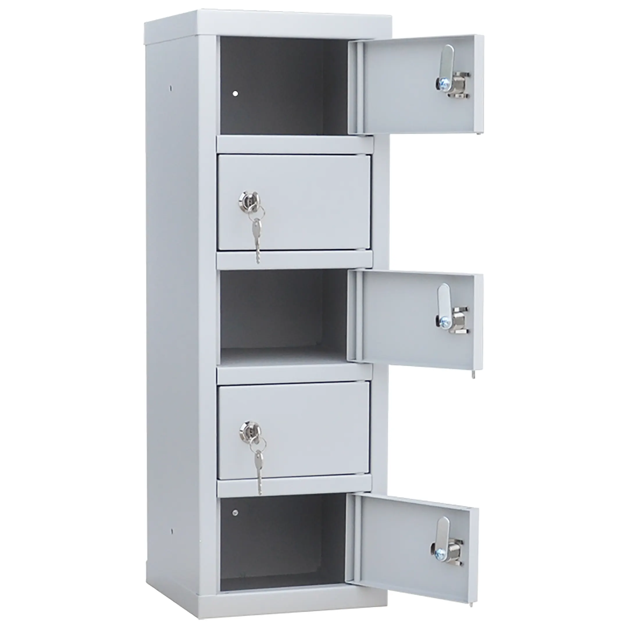 - Минималистичные размеры для размещения в любой точке — шкаф предоставляет 5 индивидуальных запирающихся ячеек в корпусе минимальных габаритов. Его можно установить непосредственно на рабочем столе, кассе, стойке администратора или в автомобиле, не занимая практически никакого полезного пространства.