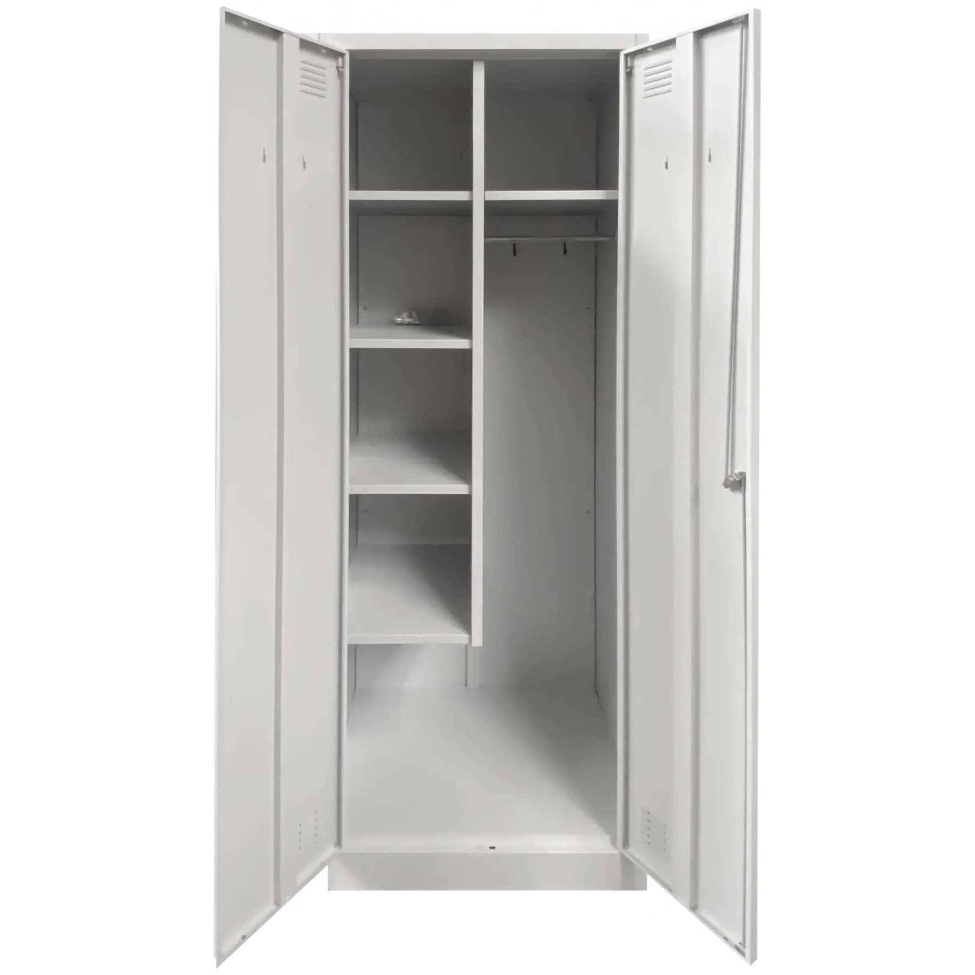 - Универсальность и функциональность — шкаф оптимально подходит для хранения всего спектра хозяйственного инвентаря: от швабр и ведер до моющих средств и рабочей одежды, обеспечивая порядок и систематизацию в любой организации.
