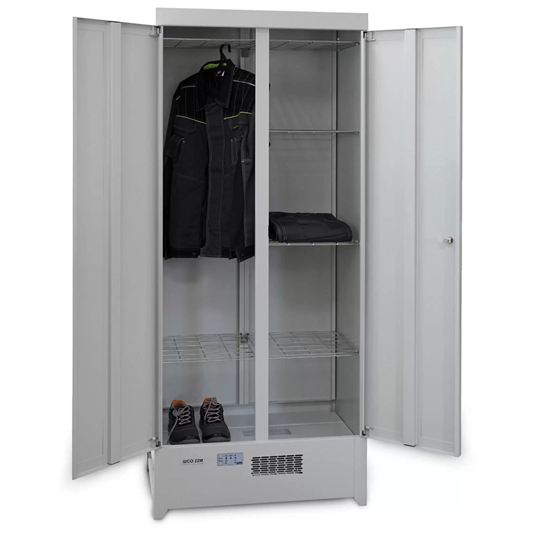 - Деликатная и контролируемая сушка — шкаф оснащен системой точного поддержания заданной температуры (до 60°C), что позволяет бережно сушить чувствительные к нагреву материалы, специальную одежду, обувь и оборудование без риска деформации или повреждения.