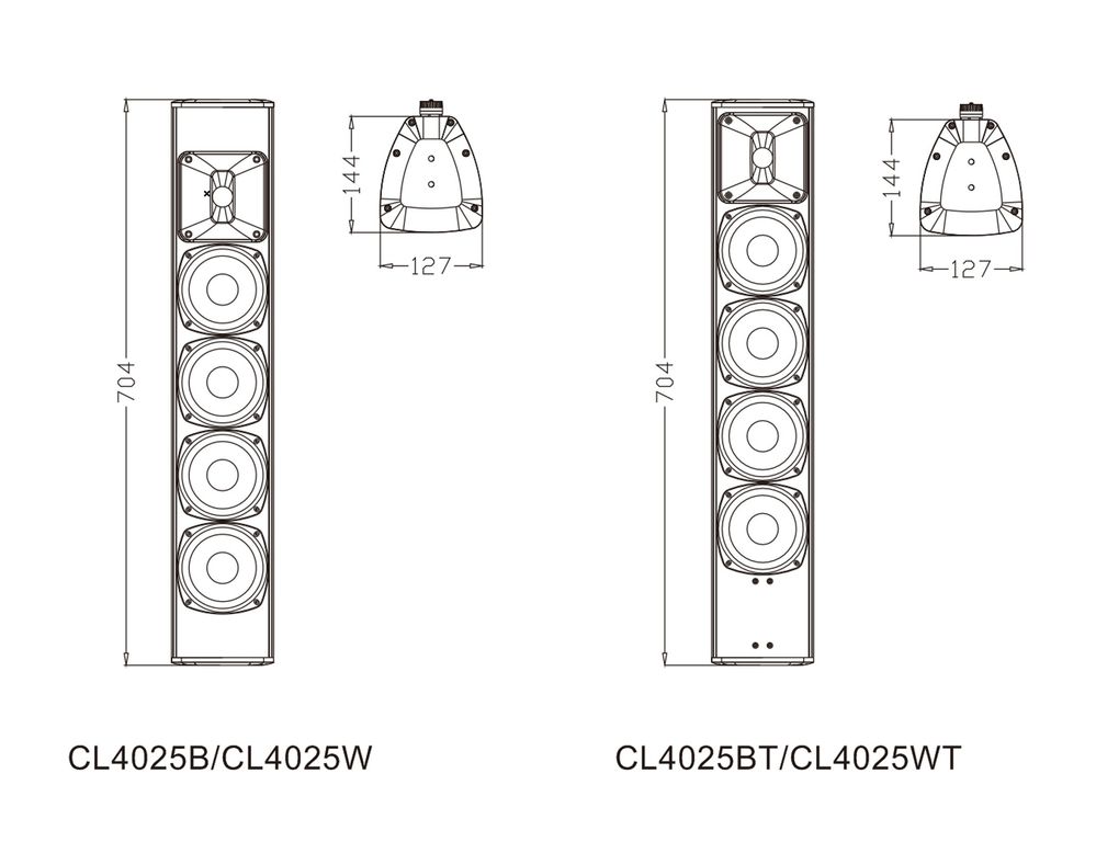 Серия CL4025 представляет собой акустическую систему колонного типа с различными цветами и функциями. Продукт соответствует стандарту IP56. Звук мягкий и сбалансированный. Корпус изготовлен из алюминиевого сплава. Буквы B и W после модели обозначают черный и белый цвет соответственно, а буква T представляет собой конфигурацию с трансформатором.